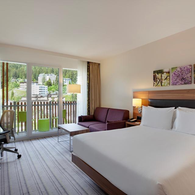De kamers zijn in stijl met de rest van het hotel modern ingericht. Vanaf het balkon heb je een prachtig uitzicht op de bergen en kijk je uit op Davos. Bij binnenkomst kom je gelijk terecht in een gezellig lobby waar je aan het einde van de dag nog een gezellig drankje kunt drinken en even opwarmt bij de open haard. Mocht je na een lange dag op de skipistes nog energie over hebben, kun je terecht in de fitnessruimte van het hotel.