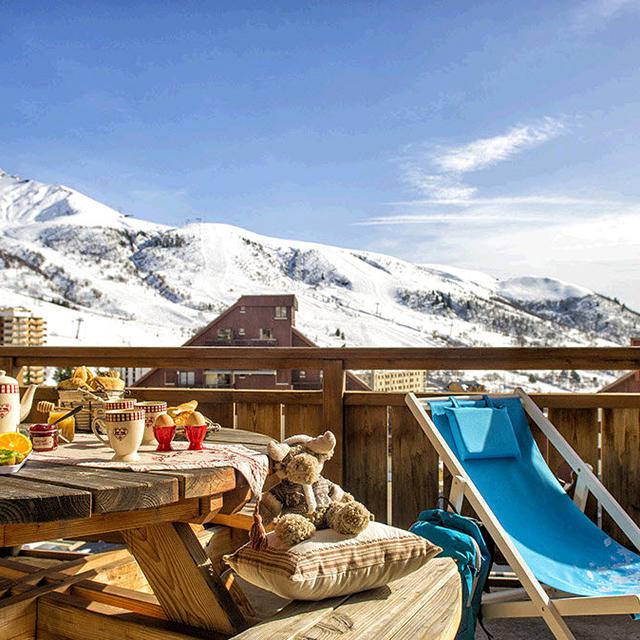 De appartementen zijn sfeervol ingericht en voldoen aan alle comfort. Met een schitterend uitzicht over de besneeuwde bergtoppen van het Grand Domaine-gebied is het genieten in het zonnetje op je balkon.
