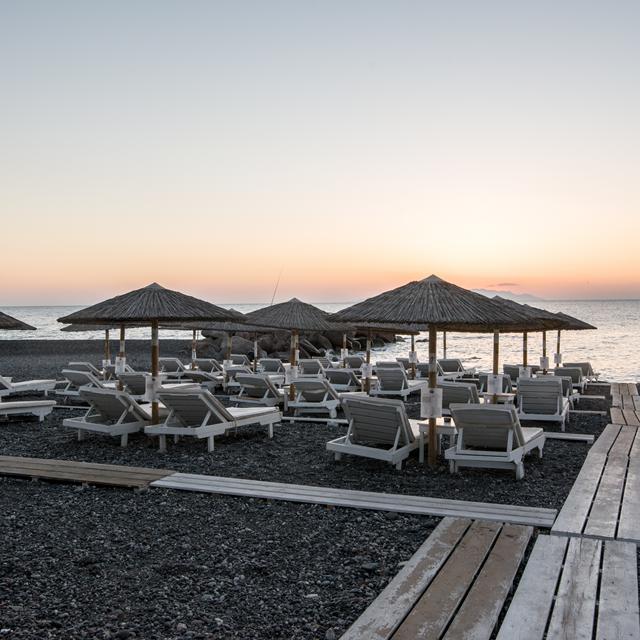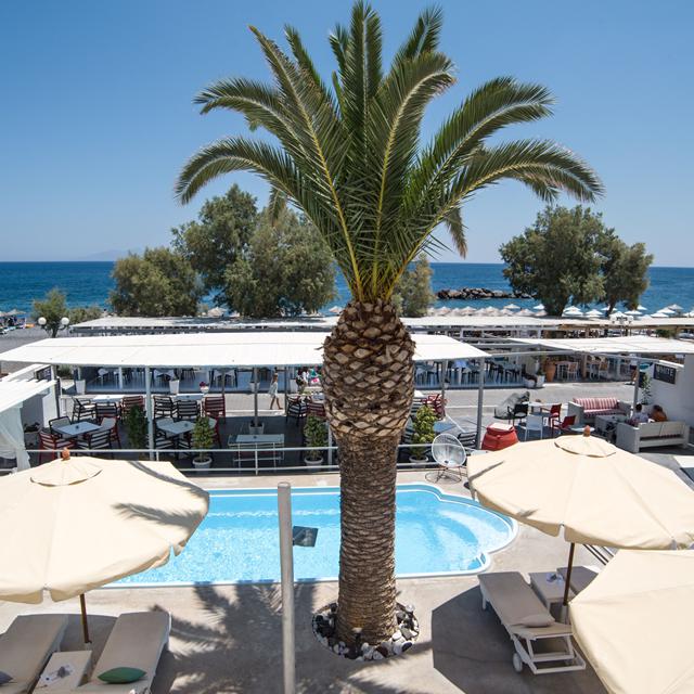 Het elegante Hotel Beach Boutique ligt direct aan het zandstrand en in het centrum van Kamari. Door deze centrale ligging zijn winkeltjes en restaurants in de omgeving gemakkelijk te voet te bereiken. Dit designer hotel heeft een trendy inrichting; in iedere kamer hangt een ander modern kunstwerk. De rest van het hotel kenmerkt zich vooral door de witte inrichting met rode en zwarte accenten.